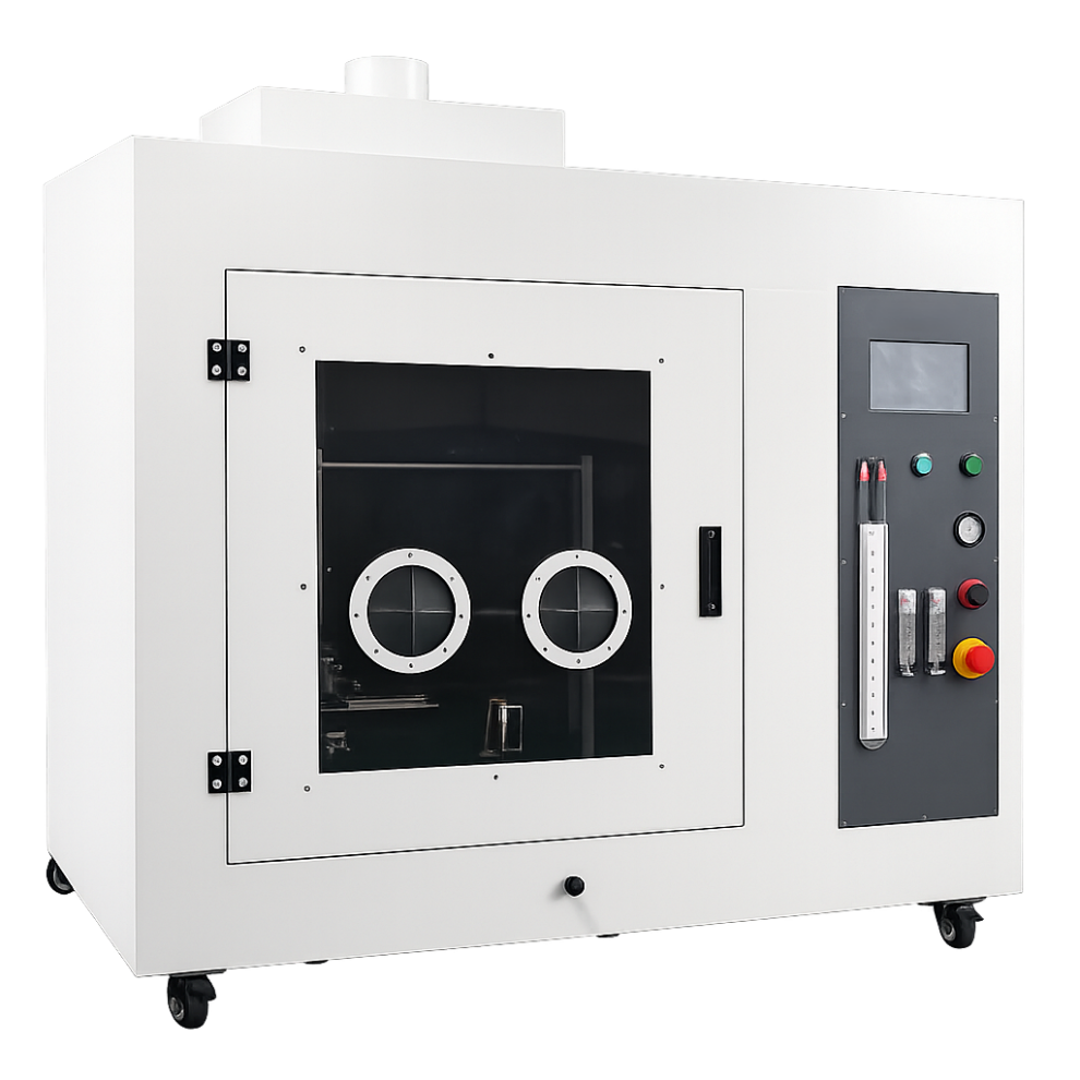 Испытательная камера выполнена в виде закрытого корпуса со смотровым окном из термостойкого стекла и автоматической системой отвода отработанных газов. Автоматический поджиг, регулируемые углы установки горелки и сенсорная система управления обеспечивают стабильность параметров испытаний, безопасность эксплуатации и воспроизводимость результатов.