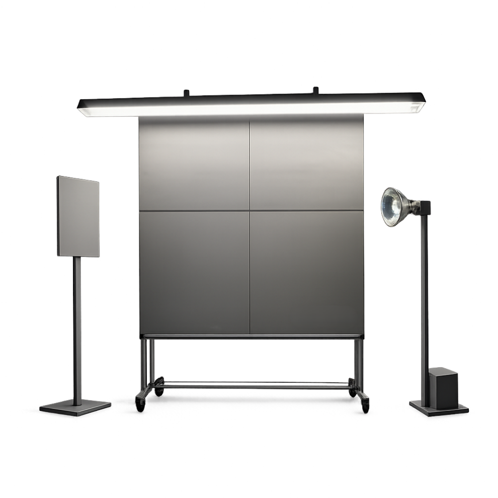 Конструкция панели предусматривает удобное крепление образцов с помощью магнитных элементов и мобильное исполнение на колёсах, что позволяет использовать оборудование в лабораториях и производственных помещениях без ограничений по окружающей среде.